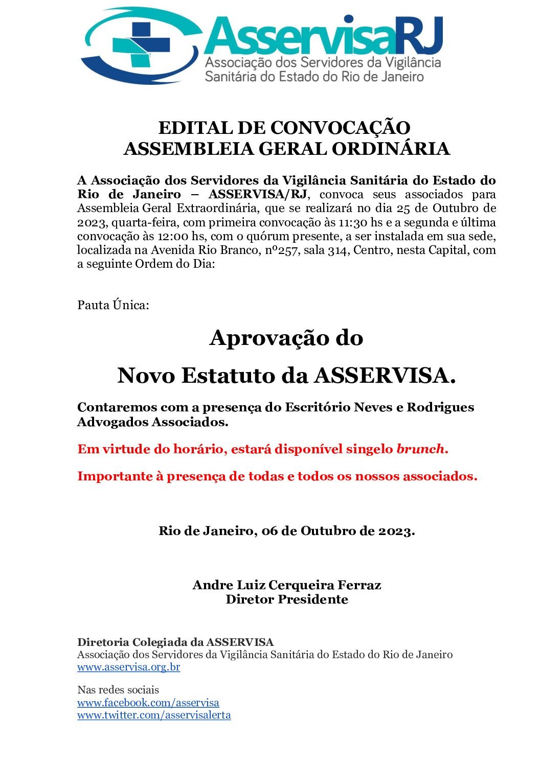 Temos um compromisso muito importante nesta quarta, a ASSERVISA vai aprimorar o seu Estatuto, permitindo: a filiação de colegas das VISAs Municipais, o aperfeiçoamento do processo eleitoral, a instituição de assembleias e votações virtuais, a constituição de delegados municipais e regionais, entre outros avanços!